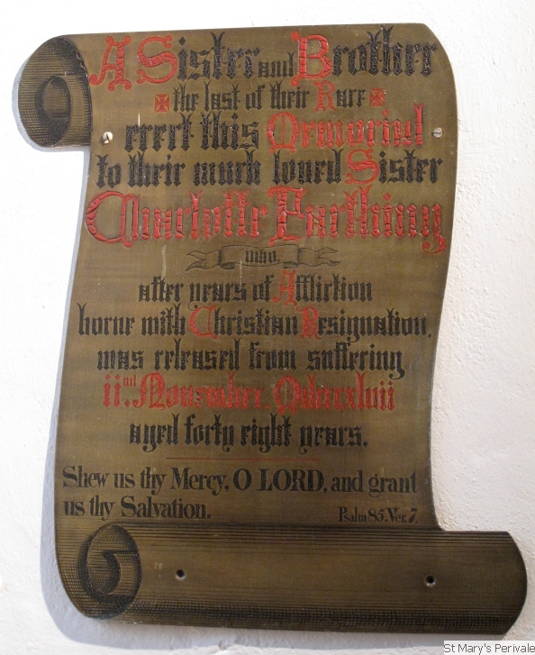 John Farthing - Churchwarden and author c 1850John Farthing was born in Somerset around 1805, and worked in London as a clerk. He then came into an inheritance, cared for his widowed mother until her death, and then married his cousin Agnes. He came to live at the Rectory in 1845, aged 40, with his wife Agnes and two sisters, namely Charlotte who was an invalid and Elizabeth who devoted her life to her siblings' care. Tragically, his wife was killed 3 weeks after their arrival, following a carriage accident. He spent considerable sums in renovating both the Rectory and the Church. He became Churchwarden in 1846, and repainted the church and bought a barrel organ and made various improvements. Notably, he wrote four manuscripts about Perivale with many charming drawings, particularly of the church before the Victorian restoration, which are an invaluable record of Perivale in 1850. These have never been published but available for perusal at Ealing Reference Library. Unfortunately he encountered serious financial problems, having stood security for a large sum of money, and was facing financial ruin. He took over the lease of Grange Farm in 1857, without any prior knowledge of farming, and wrote a detailed account of his unsuccessful efforts to make this venture succeed. He was asked to vacate the Rectory for a curate in 1861, and was rendered homeless. He left Perivale that year as a broken man, but within a few months had married Miss Eleanor Jessie Smart, who brought some happiness to him and his sister Elizabeth for a few more years. His wife is buried in the nave, marked by an inscription hidden by the carpet, and there is an attractive memorial plaque to his invalid sister Charlotte, who died in 1847, on the wall at the back of the nave, behind the font. His books contain many drawings and sketches which are reproduced here and in our image galleries (Farthing1 and Farthing2) . They provide a unique insight into the church and rectory around 1850. ![]() ![]() ![]() ![]() ![]() ![]() ![]()