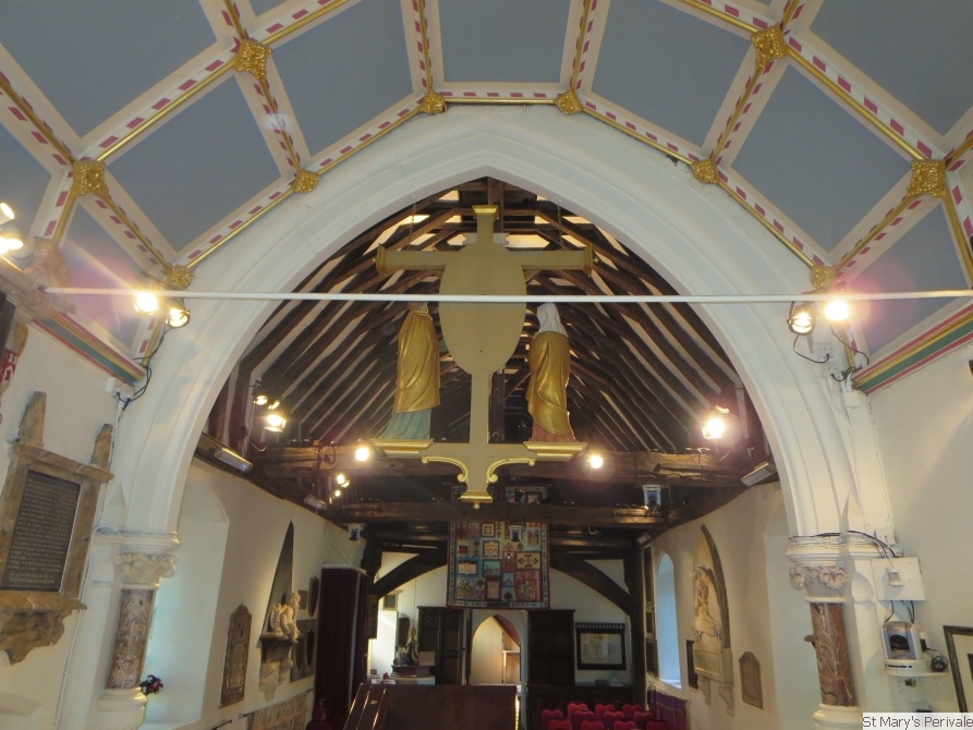 The ‘Leper Window' and 'Weeping Chancel'A 'leper' window or hagioscope is fairly common feature of medieval churches. They were provided so that lepers, who were forbidden to mix with the general population, could observe the elevation of the Host during the Mass through the window. Leprosy was brought to Britain by soldiers returning from the Crusades around 1200, and ‘lazar' houses were built outside cities, including one in Knightsbridge, so it is possible that a small leper colony may have existed in Perivale. A more prosaic explanation of the window is to provide more light to the priest reading the divine office. The Chancel deviates slightly but definitely from the east-west line of the nave, with a distinct 'tilt' to the left. This is more than can be accounted for by chance, and is obvious when pointed out to onlookers, although difficult to illustrate in a photograph! This is another fairly common feature of medieval churches, and was thought to represent the leaning of Christ's Head upon the Cross. Another recent explanation relates to the variable date of Easter, since the exact eastern axis of the chancel would have been determined by the position of the rising sun on Easter Day.