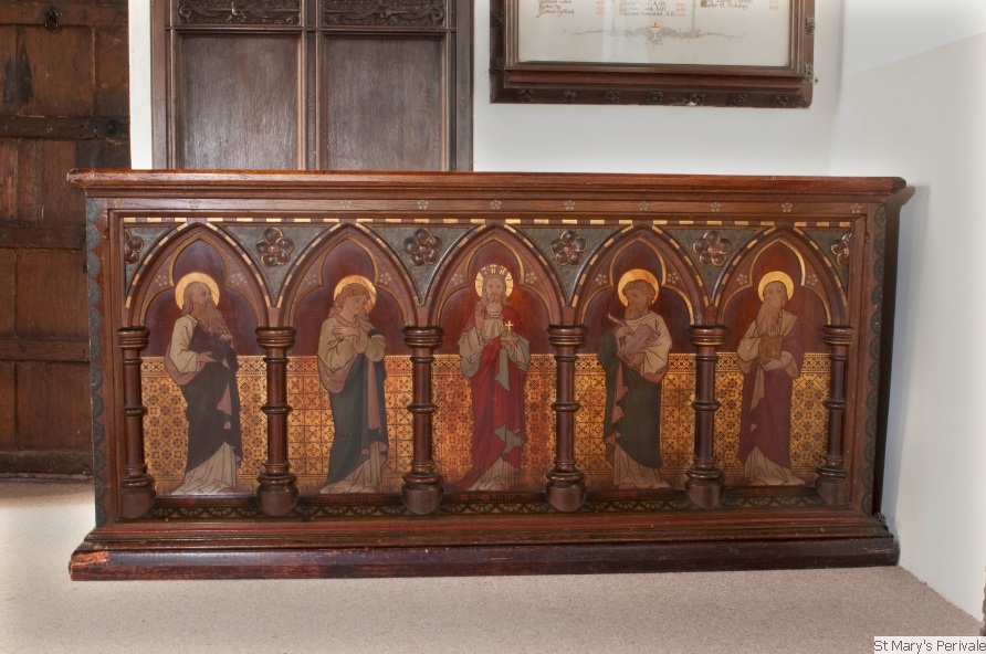 Font and Victorian altarThe font dates from around 1490, and its impressive carved oak cover from 1665, as indicated by its inscription ‘This was the gift of Simon Coston, Gent, March 26th, 1665.' In the 18th century the font was said to have been ‘defaced by a nasty yellow paint which gives it a most tawdry and paltry appearance.' Subsequently it was removed and ‘lost' beneath piles of rubble within the tower. The vestry minute-book from 1836 records ‘that a font with a lid for christenings be not ordered, on the score that, in point of fact, there are no christenings for parishioners of Perivale, nor likely to be any.' The Victorian altar, now situated at the back of the nave, was acquired by Dr Hughes in 1879. The composition is described as ‘an arcade of 5 panels in carved and moulded oak, with columns of Canadian walnut amply relieved by gilding and colour. The centre is occupied by a figure of our Lord as King of glory, and the 4 remaining panels, 2 on each side, by figures of the Evangelists.' It was apparently designed by a member of the choir. ![]() ![]() ![]() Previous .......................................................Point mouse to enlarge any image......................................................Next Home